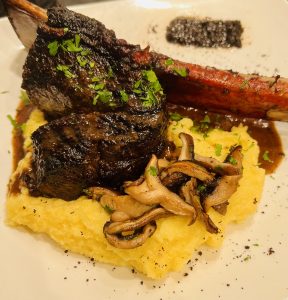 - Plate short Rib with Polenta and Black Garlic Reduction